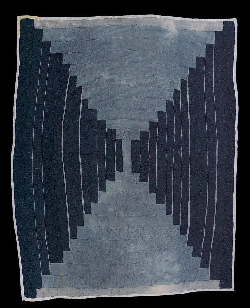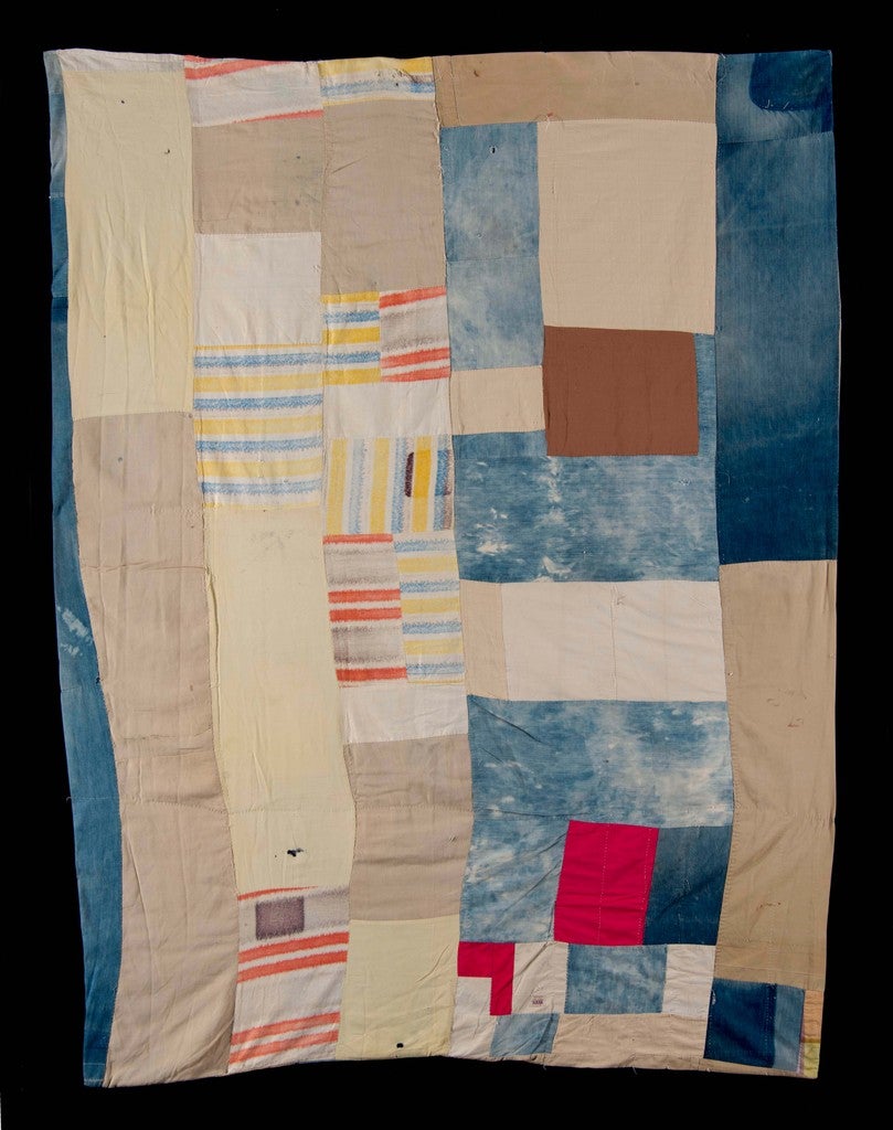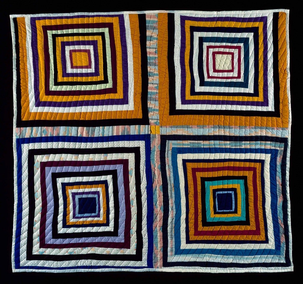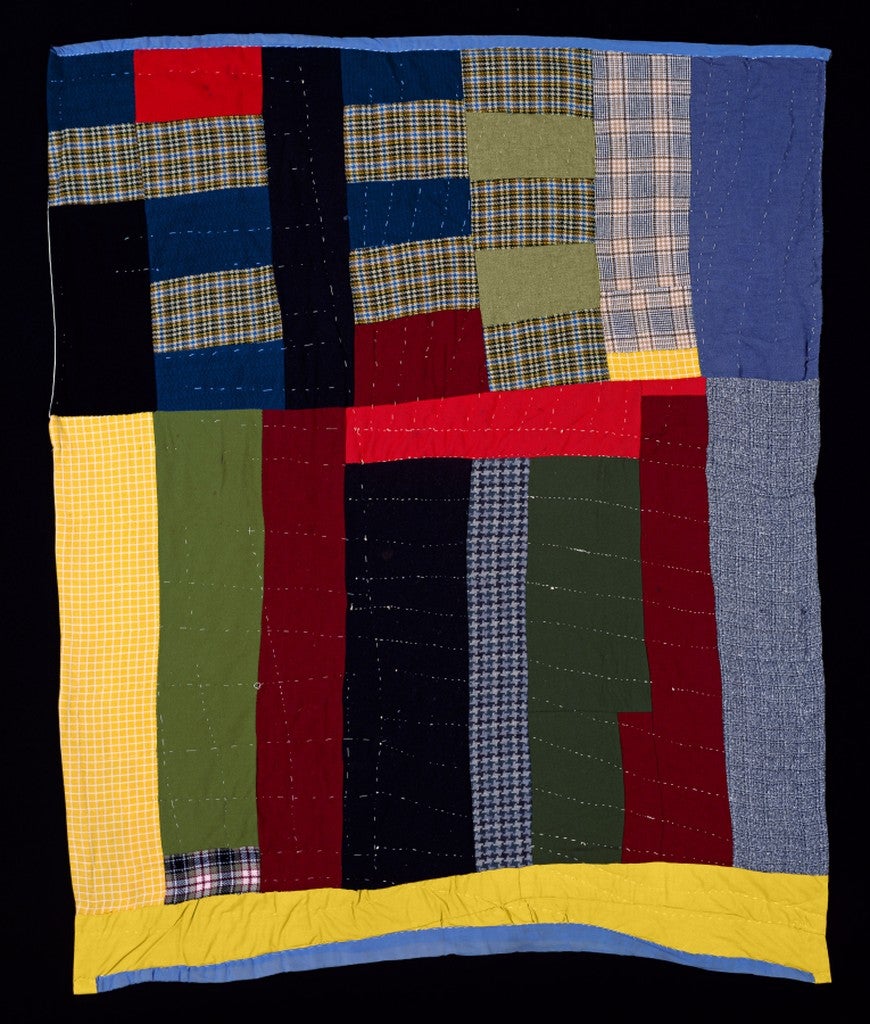 Bold contrasts, asymmetry and varied textures highlight the Pieced Quilt, 1974, made by Alberta Miller (died 1999) who lived in Dallas County, Alabama, near Gee’s Bend. Miller, a mother of 20 children (and possibly more) and a caregiver made the quilt for a white girl as a high school graduation gift.