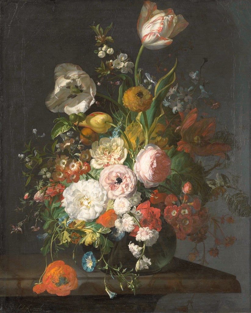 Scientific observation and precision governs the art of the next three practitioners: Giovanna Garzoni, Maria Sybilla Merian, and Rachel Ruysch. Born in the region of Le Marche, Garzoni (1600-1670) worked at the Medici court in Florence producing botanical and zoological renderings, most in tempera on vellum, like the diminutive Still Life with Citrons. Another rediscovery by Mary Garrard, Garzoni’s skill was honored by a retrospective at the Uffizi in 2020. Merian (1647-1717) was a Netherlands-based naturalist, entomologist and botanical illustrator who is best-known for her brilliantly crafted treatise on insects, the Metamorphosis Insectorum Surinamensium that she researched in Surinam and completed with the assistance of her two daughters. Here she is represented by a Still-Life with Fruit, gouache on parchment, a fitting pendant to Garzoni’s citrons. Merian’s reputation was deliberately degraded by at least one scientific writer in the 19th century, and it was not until the 1990s that her reputation was rehabilitated by historian Sharon Valiant. She and her daughters were commemorated by an exhibition at the J. Paul Getty Museum in 2008. The Dutch painter Rachel Ruysch (1664-1750) rose highest with a position at the court in Düsseldorf, and works fetching the richest prices on the contemporary market–mostly flower still life paintings exceeding even Rembrandt’s rates. Her training with her anatomist father and the still life painter Willem van Aelst combined the skills of art and science, perfectly suited to her immaculate yet teeming paintings like the Still-Life with flowers. The painter maintained a thriving career in a male-dominated field while raising ten children. She was documented in a dissertation by Marianne Berardi in 1998.