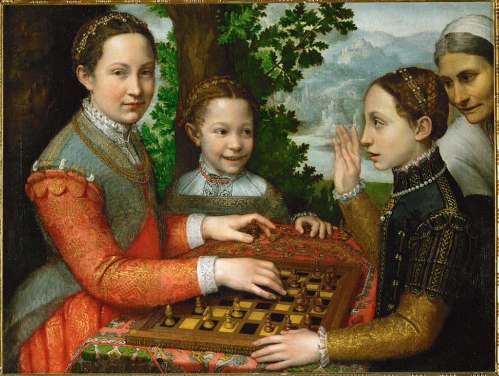 Sofonisba Anguissola (1532-1625) was the most accomplished of six artist sisters. She worked at the royal court in Madrid, specializing in portraiture. In The Game of Chess, three of the painter’s sisters are portrayed with warmth and candor, while the single portrait of Alessandro Farnese is more formidable and guarded. All of the sitters are attired in characteristically splendid detail. On her death at the age of 93, Anguissola’s husband composed her epitaph: “To Sofonisba, my wife, who is recorded among the illustrious women of the world, outstanding in portraying the images of man.” The scholars Garrard, Pollock, and Parker have also ensured her place in the pantheon, and she was recently honored by an exhibition at the Prado.