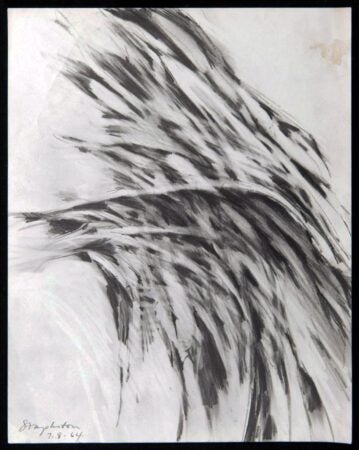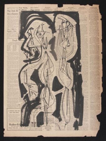 Finally, the following two drawings, from a series of nearly 100 recovered from Stapleton’s 1950-1952 New York Times series, perfectly illustrate Stapleton’s transition from his early self-training of Japanese calligraphy and his devotion to Arshile Gorky to his individual expression with the line intelligence he learned through the calligraphy practice books.