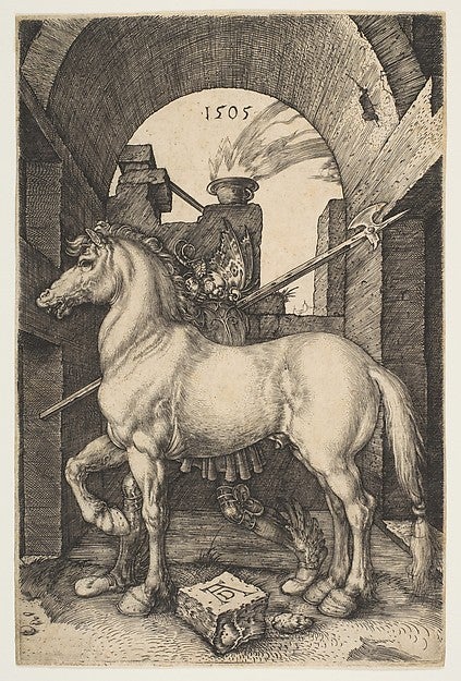 Today, nearly 150 years later, The Met is among leaders worldwide with an encyclopedic collection that numbers more than 2 million objects, spanning 17 diverse curatorial departments and 5000 years, from antiquities to photography, and including masterworks in all fields. Its range may be documented by countless juxtapositions of outstanding works from diverse cultures, as for example, an ivory handle from ancient Egypt, Prancing Horse, ca. 1391-1353 B.C.E., an engraving by the German Renaissance artist Dürer, The Little Horse, 1505. and a monumental painting by Rosa Bonheur, The Horse Fair, 1853-55, each depicting horses, albeit of very different stripes.