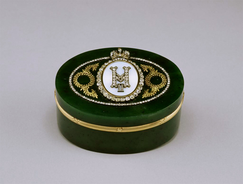 Peter Carl Fabergé; Workmaster: Henrik Wigström; Manufacturer: House of Fabergé, Russian | Oval Box with Monogram of Nicholas II | early 20th century | nephrite, gold, diamonds, enamel | The Walters Art Museum