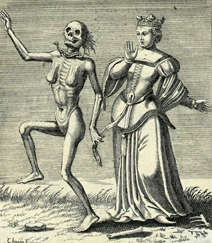 The etchings in this slide show were made in the mid-18th century by Jacques-Antony Chovin based on prints by Matthäus Merian from a century before. They come to us from the Harry Ransom Center (University of Texas at Austin). Search for Chovin’s name in the Artstor Digital Library to see the accompanying text, which includes dialogues between death and her victims.