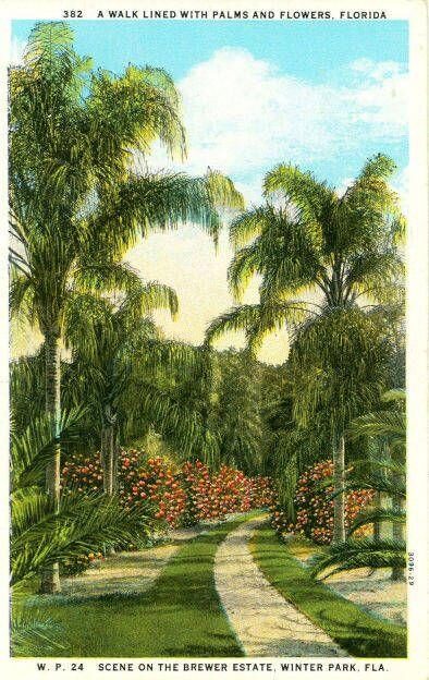 A vintage postcard illustration of a walkway lined with tall palm trees and colorful blooming flowers at the Brewer Estate in Winter Park, Florida. The path curves gently into the lush landscape under a bright blue sky. Text at the top reads “A Walk Lined with Palms and Flowers, Florida.” Courtesy of the Rollins College Archives.
