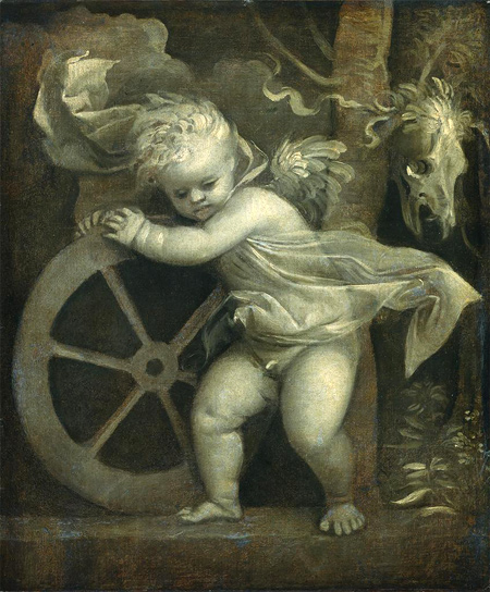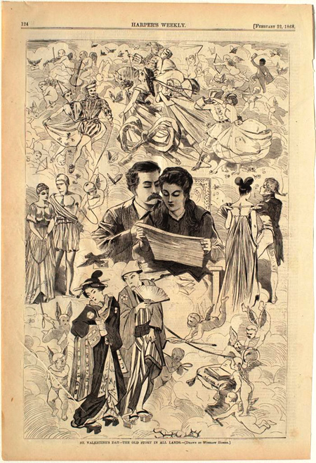 We don’t see many images of St. Valentine on his holiday, possibly because martyrdom won’t put your sweetheart in a romantic mood (though you’re welcome to test it out by showing them the 15th century woodcut from The Illustrated Bartsch above). Instead, in addition to hearts, we often see images of cupid, the god of desire, affection, and erotic love from Roman mythology. Cupid was a popular motif in Medieval and Renaissance art, and a keyword search in the Artstor Digital Library results in more than 1,000 images. The whimsical image included in our slide show of “Cupid on a Wagon Drawn by Snails” by the workshop of Raphael (from Italian and other European Art (Scala Archives)) seems to encourage love to move slowly, while Titian’s contemporaneous “Cupid with the Wheel of Fortune” (from the National Gallery of Art ) strikes a gloomy note, capturing the downside of the vagaries of romance. More happily, Winslow Homer’s illustration from Harper’s Weekly (courtesy of the Sterling and Francine Clark Art Institute Collection), rife with cupids, reminds us that love transcends all eras and cultures.