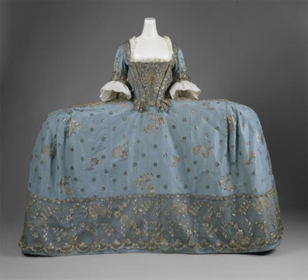 No slouch as a consumer of extravagant fashion, Marie Antoinette wears another extreme look in her portrait of 1778 painted by Elisabeth Louise Vigée-LeBrun. By this time the young monarch was fully in the thrall of designer Rose Bertin, dubbed the “Minister of Fashion” by the scornful French. A robe à la française, c. 1750, attests to the volume of the skirt, supported by outsized panniers typically constructed of willow or whalebone. By its very design such a garment precluded work or activity. Its wearer would have to turn sideways to enter a room.